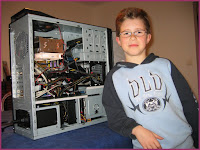 Le PC ouvert, montage terminé, avec mon inspecteur des travaux finis, j'ai nommé Valentin.